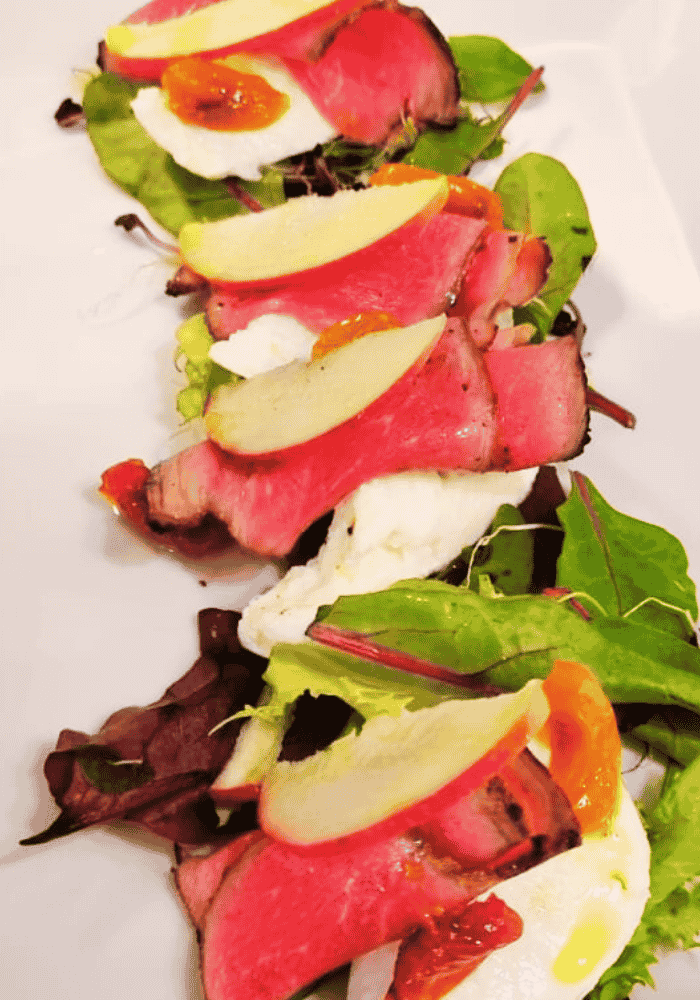 Carpaccio d’angus, pomme Pink Lady marinée, feuilles d’épinard cristallisées et jeunes pousses, poudre d’olive noire, huile à la grenadille.