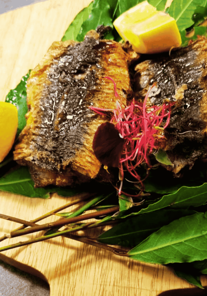 Filets de sardines farcis (mie de pain maison, pecorino, pignons, raisins secs), légèrement farinés puis rôtis au four, servis sur feuilles de citron, huile citron–fenouil.